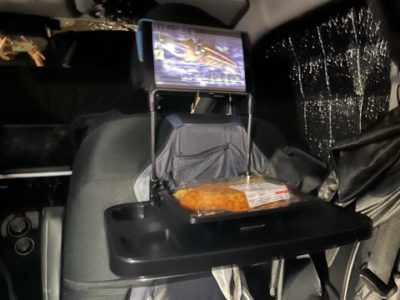 今回、新たに買った後部座席用のテーブル。前のシートに引っ掛けるタイプのやつ。