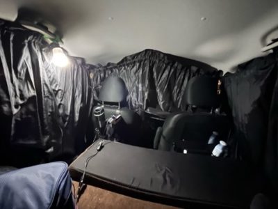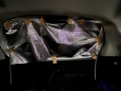 途中で車中泊時の目隠し用のサンシェードを積み忘れたことに気がついたんだけど、すでに3時間ほど走ってるから取りに帰るわけにもいかず。。登山後に着替えるための簡易カーテンを積んでるのと、あとは途中でDAISOに寄ってアルミシートとガムテープをゲットして目隠し。