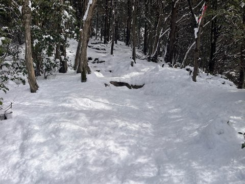 靴をローカットのトレッキングシューズでゲイター(雨や雪が靴に入り込まないようにする泥除け)をつけるところに頭が回らず、靴が雪にズッポリ埋まるから上から靴の中に雪が入ってグチュグチュ。下山時は標高の低い場所の雪は溶け始めててグジャグジャ。