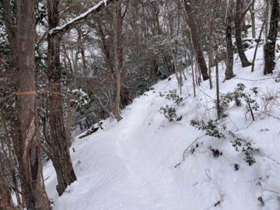 登り始めてすぐに雪。しかも誰も歩いてない新雪の雪だよ。