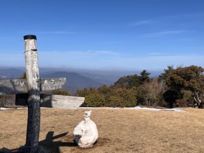 快晴で暖かい山頂に、雪だるまの残骸が残ってるのをみて、一週間前は大雪警報が出てたよなぁと思い出したりと。